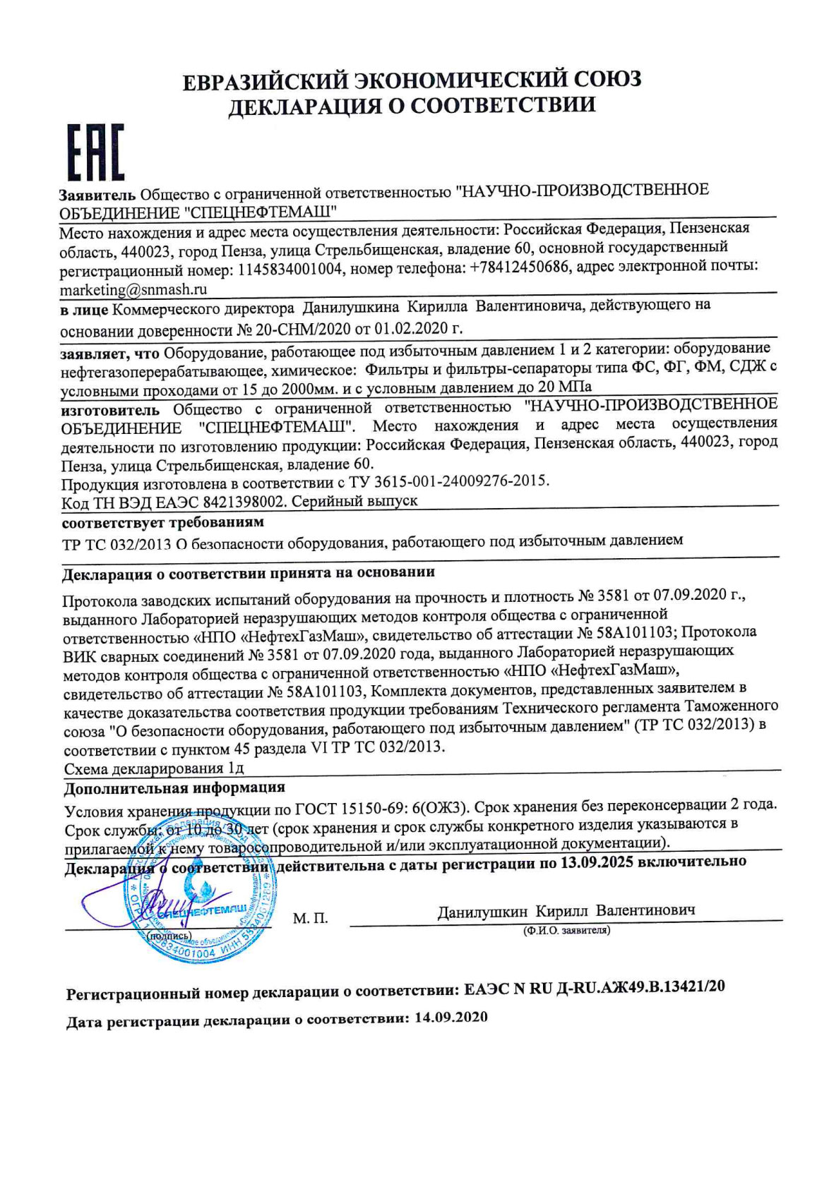 Декларация о соответствии ТР ТС 032/2013. Фильтры и фильтры-сепараторы ФС, ФГ, ФМ, СДЖ.