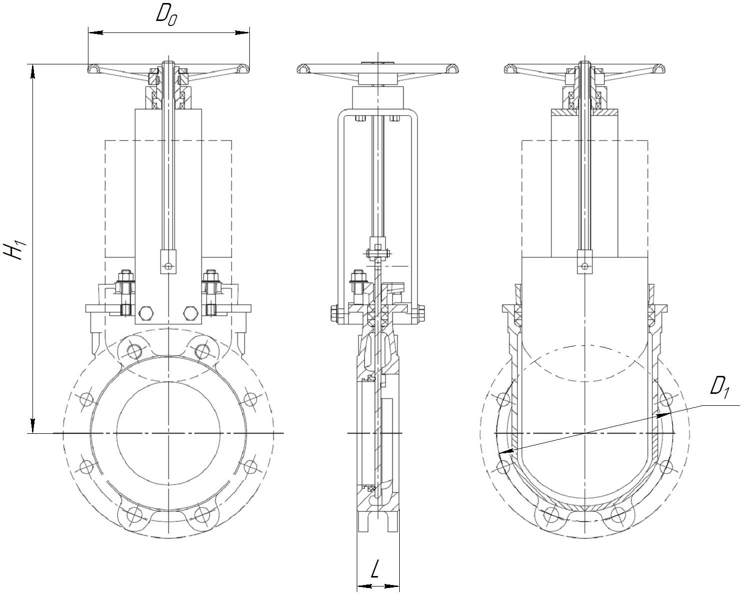 Основные габаритные и присоединительные размеры Шиберных задвижек СНМ 5854 DN50-500 мм со штурвалом